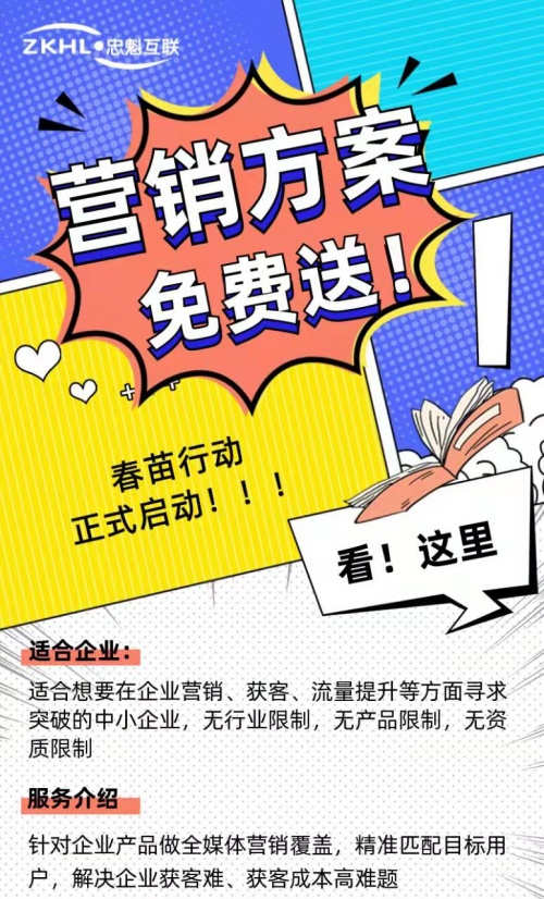 忠魁互联希望通过自己的专业知识和多年的服务经验帮助到更多的企业,推出系列产品推广营销活动,免费为企业咨询服务,并提供解决方案。我们将帮助报名参加的企业可以找出自身发展存在的关键性问题,并根据企业的真实情况,提供有用的营销推广方案。只要是又需要的企业都可以报名参加。