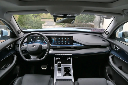 瑞虎7 PLUS内饰中控台造型简洁,大面积软性材质的包裹,细节之处的缝线处理,营造出舒适温馨的内饰氛围。中控区域全系标配的两块12.3吋的液晶显示屏,各物理按键布局规整,下方空调采用平面触控操作,看起来更加直观,常用的温度和风量调节依然保留了硕大的旋钮,方便了行车时的盲操作。瑞虎7 PLUS中央扶手箱内的水杯架和卡槽托盘可以前后移动,也可以拆卸取出,拆除后扶手箱的开口更大,方便大件物品存取。档杆台下方是一个悬浮式储物空间,方便放置随身物品。