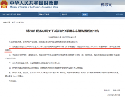 期待多日的减征部分乘用车购置税600亿大礼包正式落地,2022年6月1日-2022年12月31日期间,购买单车价格( 不含增值税)不超过 30 万元的2.0升及以下排量乘用车,减半征收车辆购置税。